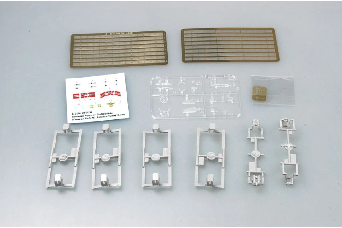 - Total Sprues: 14 sprues, upper hull, lower hull, water line plate, deck, and stand