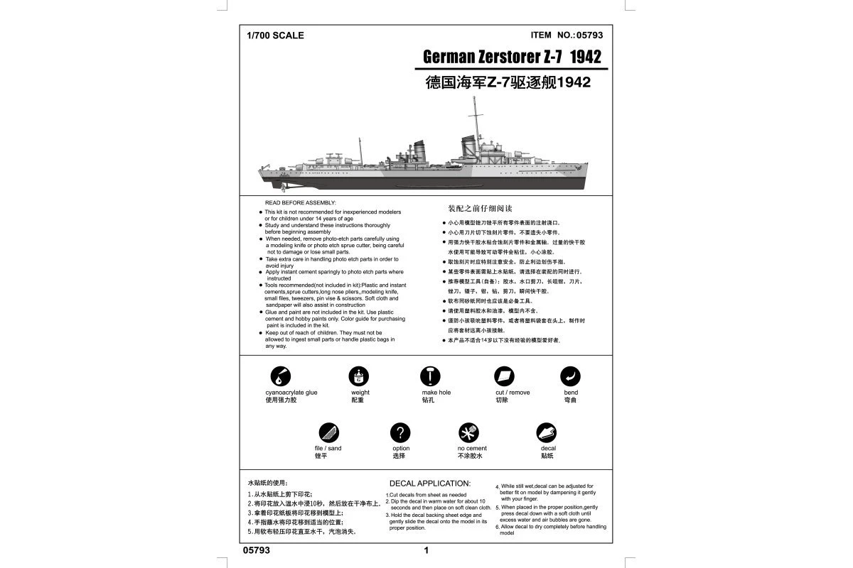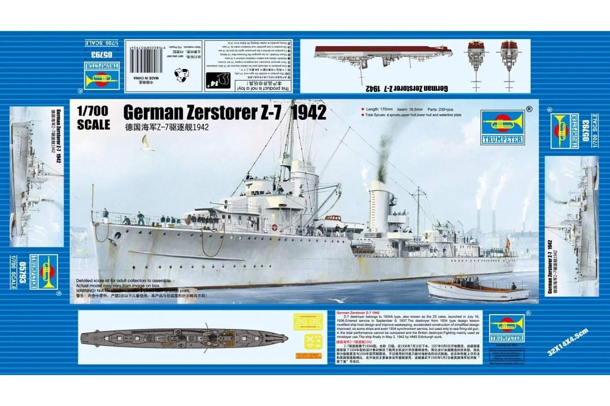 Z-7 destroyer belongs to 1934A type, also known as the Z5 calss, launched on July 16, 1936. Entered service in September 9, 1937. The destroyer from 1934 type design lesson modified ship host design and improve seakeeping, accelerated construction of simplified design improved, so some ships and even 1934 synchronism service, but used only to sea firing old gun, in the total performance cannot be compared and the British destroyer. Fighting mainly used as minelayer use. The ship finally on May 2, 1942 by HMS Edinburgh sunk.