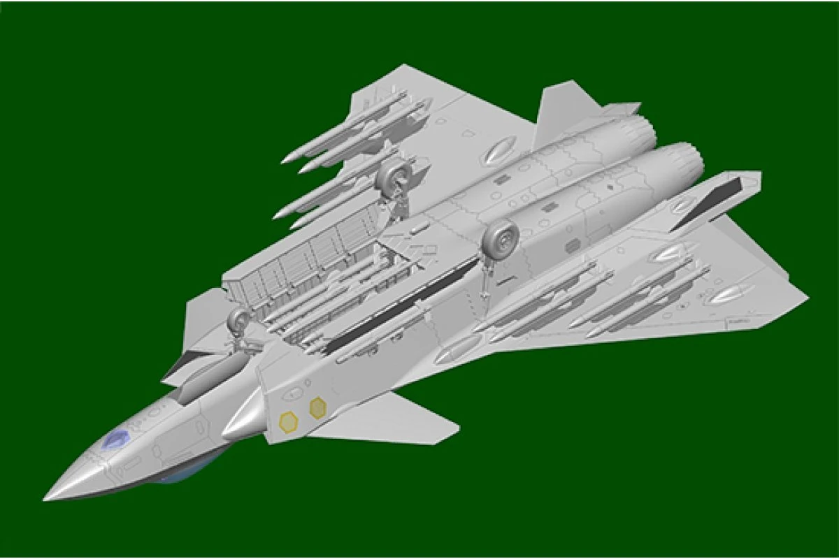 The main landing gears retract into body-side bays, indicating the likely presence of F-22-style side weapon bays