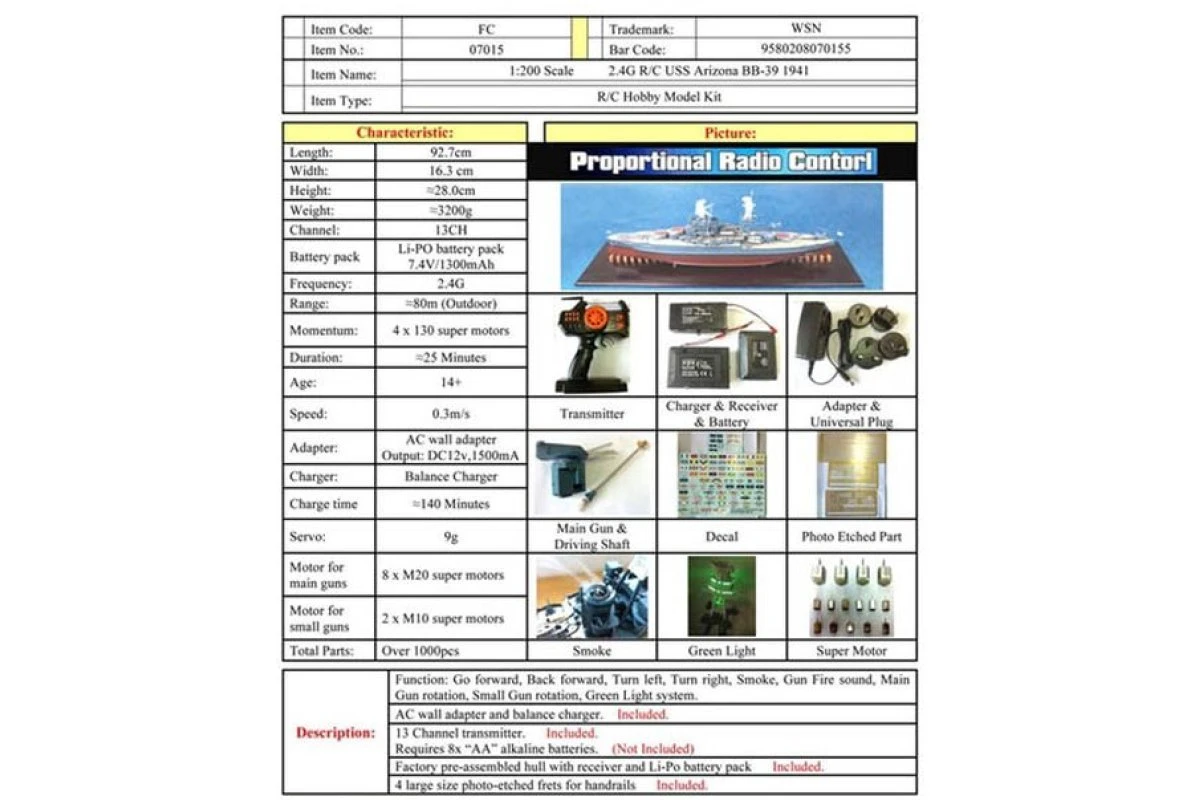 Trumpeter released a plastic model kit of the USS Arizona battleship in 2011 and then decided in 2016 to take it to another level, by producing a fully functional version via remote control. The lengths in which Trumpeter have gone to maintain a high level of scaled detail which their globally recognized for in their plastic model can also be found on this RC version of the USS Arizona BB-39 battleship, while incorporating a new high level of functionality via RC is incredible.